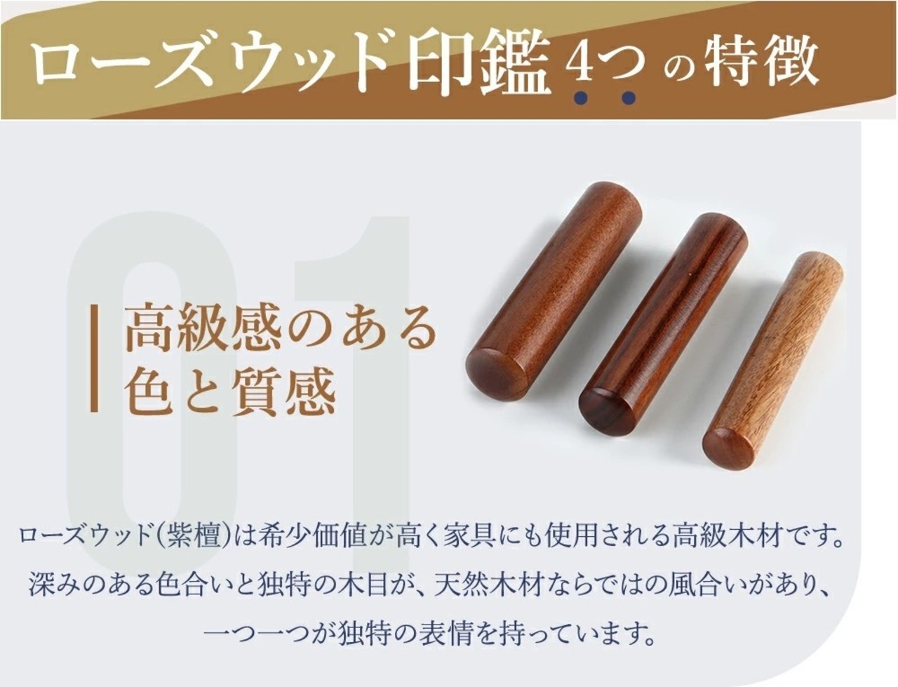 耐久性:ローズウッド(紫檀)は非常に硬く丈夫な材質です。耐久性に優れ長期間にわたってくり返し使うことができ、常に安定した印影を保証します。